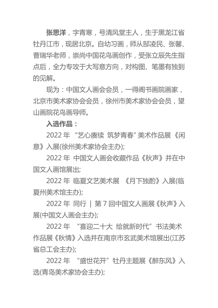 张思洋,字青寒,号清风堂主人,生于黑龙江省牡丹江市,现居北京。自幼习画,师从郜凌民、张馨、曹瑞华老师,崇尚中国花鸟画创作,受张立辰先生指点后,全力专攻于大写意方向,对构图、笔墨有独到的见解。