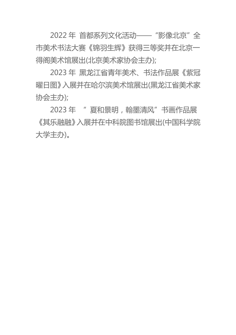 2022年 首都系列文化活动——“影像北京”全市美术书法大赛《锦羽生辉》获得三等奖并在北京一得阁美术馆展出(北京美术家协会主办);